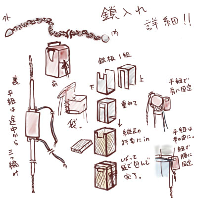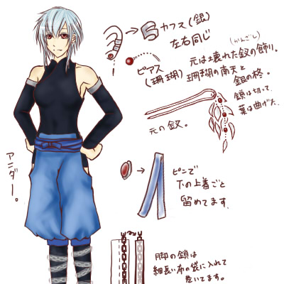組織で「くの一に育てるのは無駄だろう」と判断されてから、着飾ったりとか殊更女らしい事を厭う様になった景に、「せめてこれ位の飾りは身に付けたっていいだろう」と世話役の兄弟子と姐さんが壊れた簪の飾りから、中国の耳環や外国のピアスを参考に作ったもの。